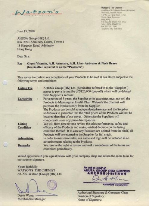 美國(guó)愛(ài)華集團(tuán)(香港)有限公司與屈臣氏連鎖機(jī)構(gòu)簽訂的銷售合約